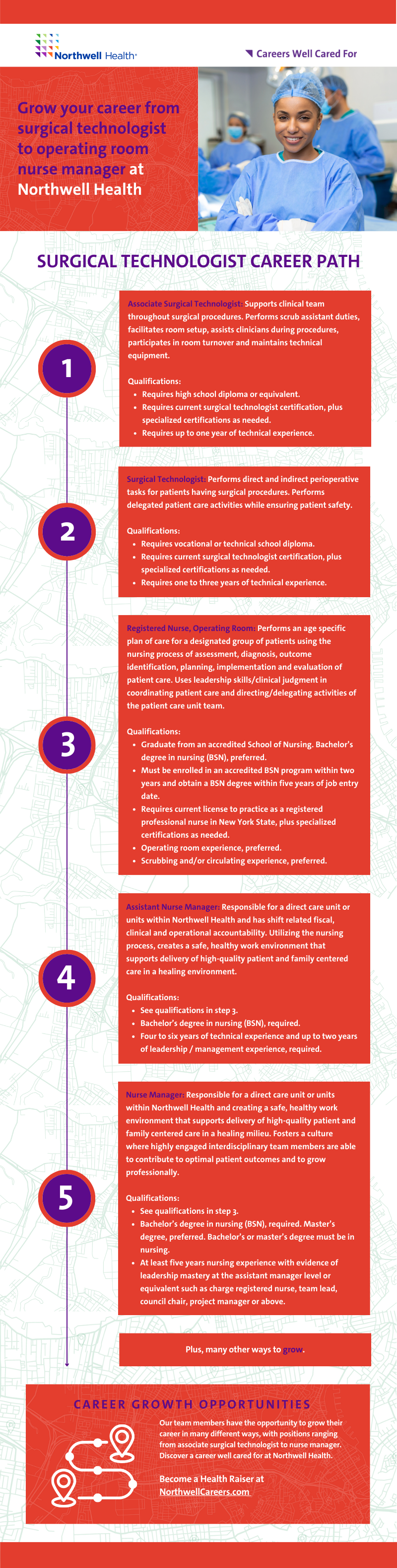 Below, you can learn more about one of the many ways you can grow in your surgical technologist career, from associate surgical technologist to nurse manager. For the complete job profiles of each role, we invite you to visit NorthwellCareers.com or click on the link below to discover a career well cared for at Northwell.