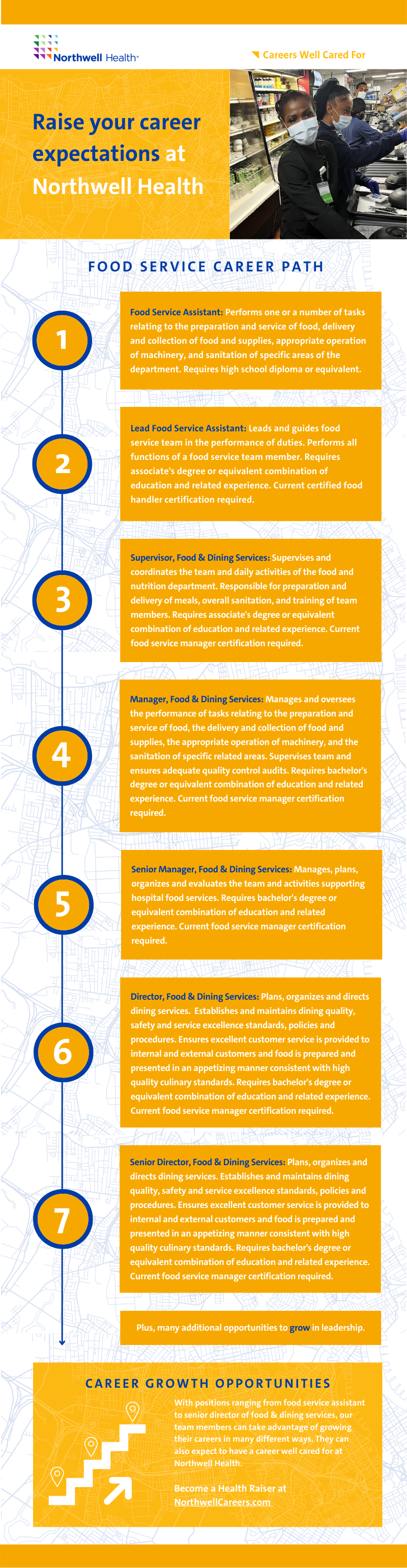 Whether your career journey is just starting out or you’ve begun to explore a new direction, Northwell has the resources to support and guide you on your path. Below, you will find information about the many career paths for food service. For the complete job profile, we invite you to visit NorthwellCareers.com, or click the link below to discover a career well cared for with our team.